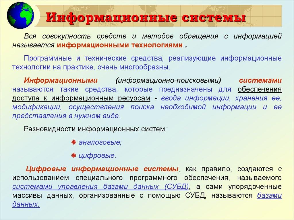 Информационные системыВся совокупность средств и методов обращения с информацией