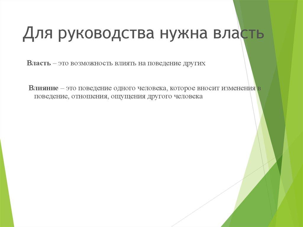 Для руководства нужна властьВласть – это возможность влиять на поведение других