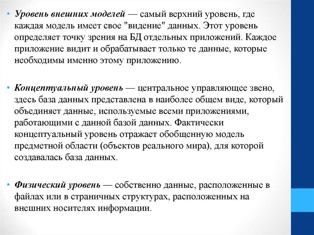 • Уровень внешних моделей — самый верхний уровень, гдекаждая модель имеет свое "видение" данных. Этот уровень