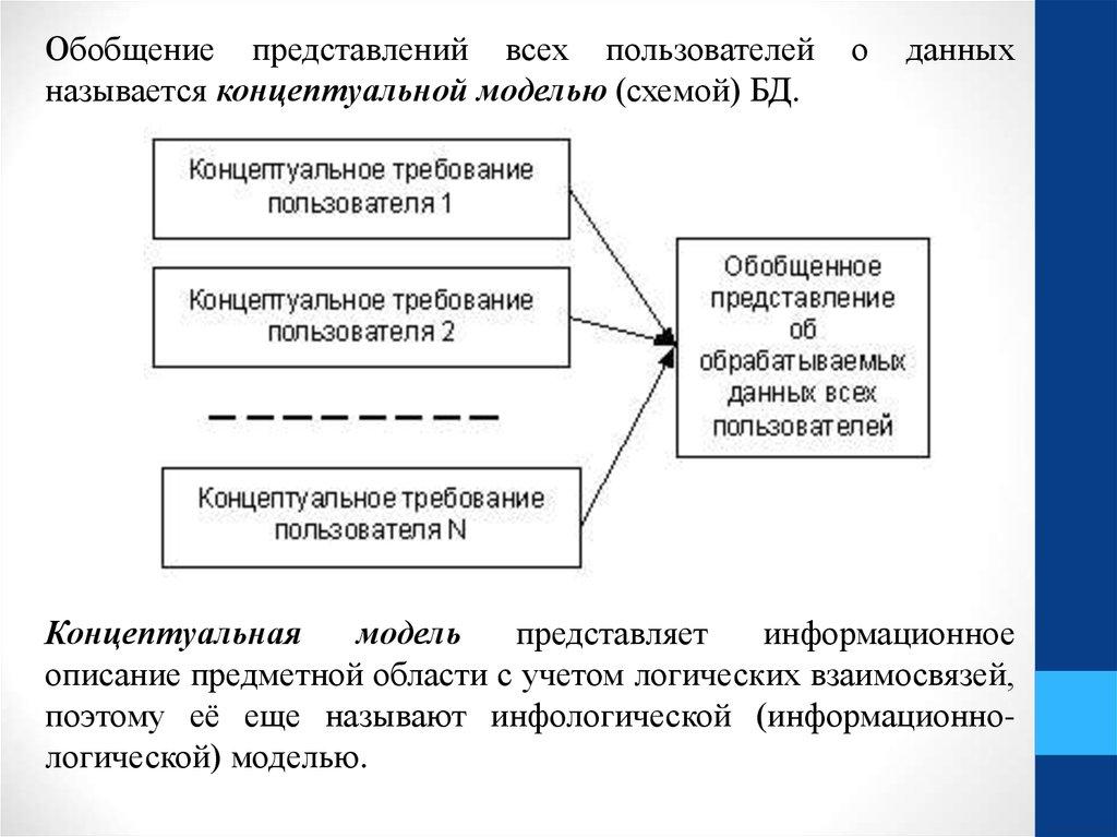 Обобщение представлений всех пользователейназывается концептуальной моделью (схемой) БД.