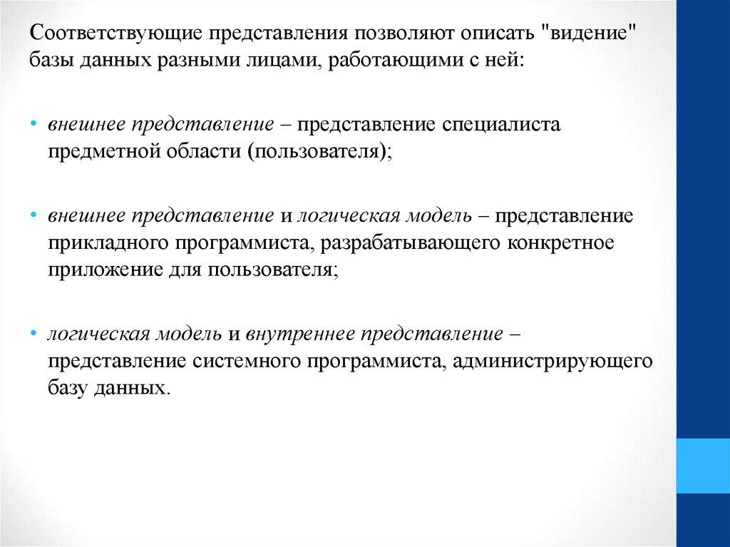 Соответствующие представления позволяют описать "видение"базы данных разными лицами, работающими с ней: