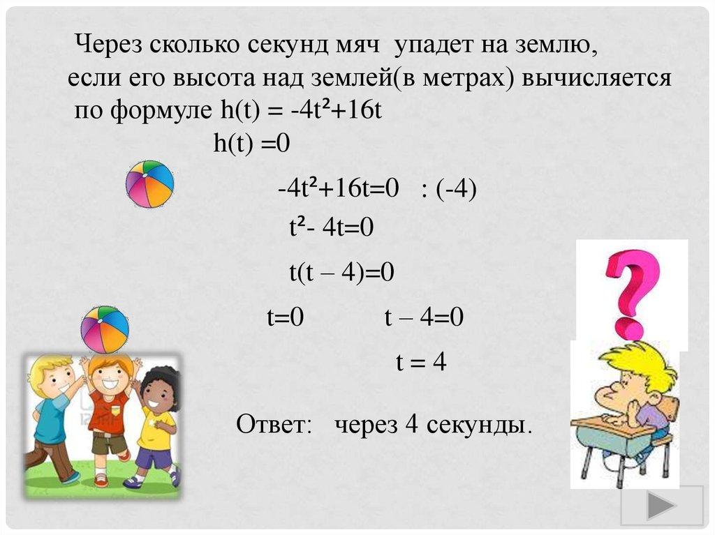 Через сколько секунд мяч упадет на землю,если его высота над землей(в метрах) вычисляется