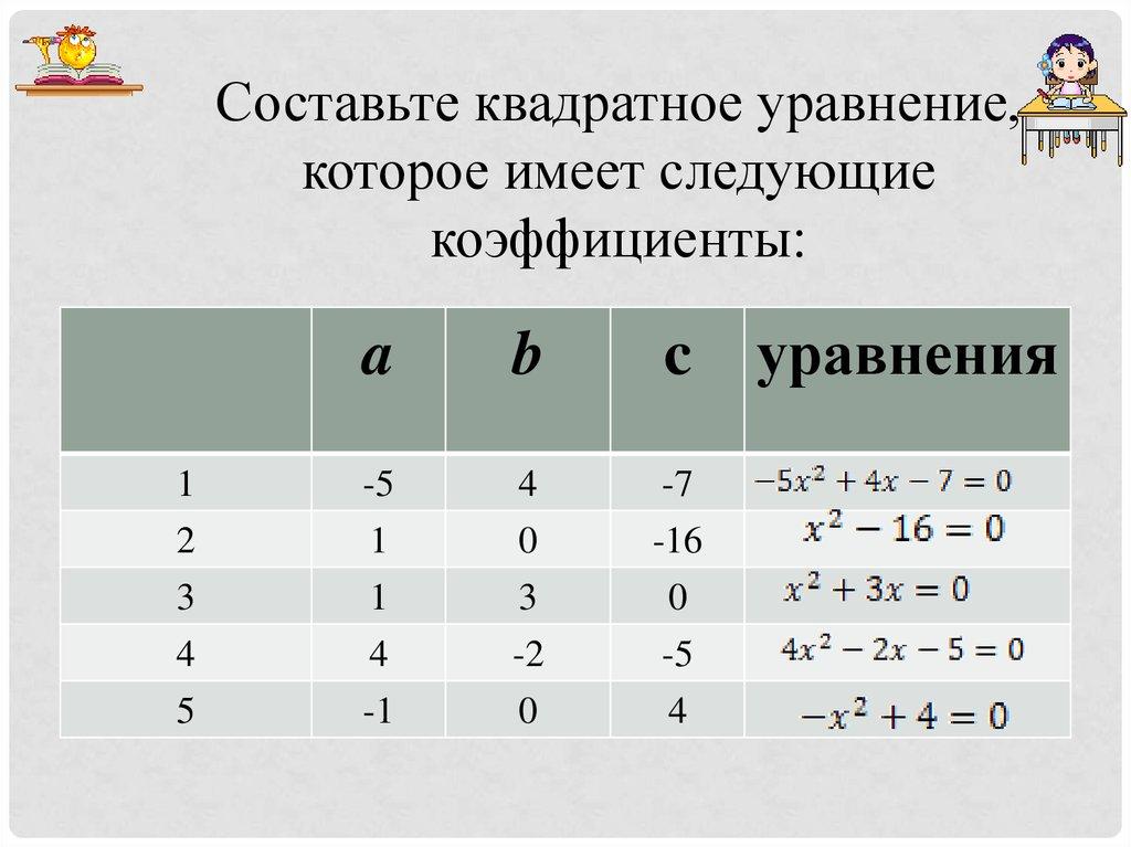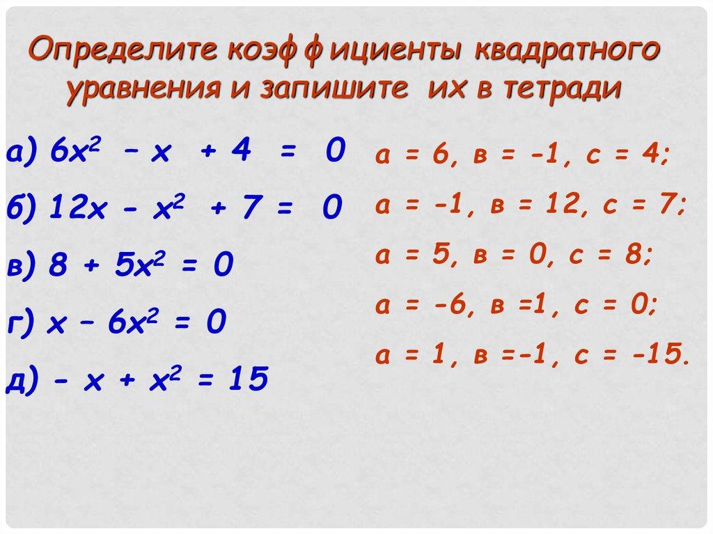 Определите коэффициенты квадратногоуравнения и запишите их в тетради