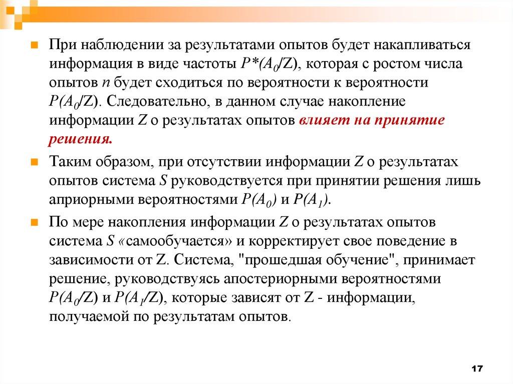 По мере накопления информации Z о результатах опытов