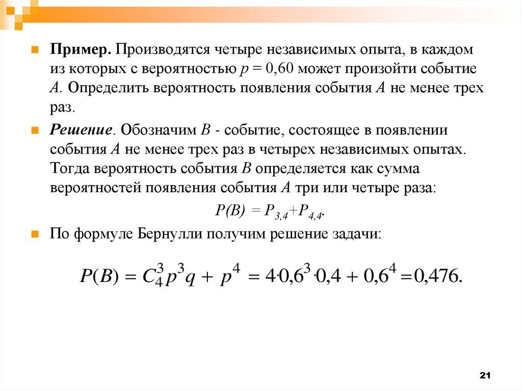 А. Определить вероятность появления события А не менее трех