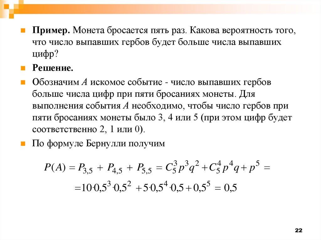 Пример. Монета бросается пять раз. Какова вероятность того,что число выпавших гербов будет больше числа выпавших