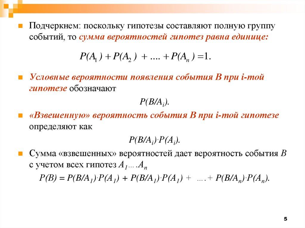 Подчеркнем: поскольку гипотезы составляют полную группусобытий, то сумма вероятностей гипотез равна единице: