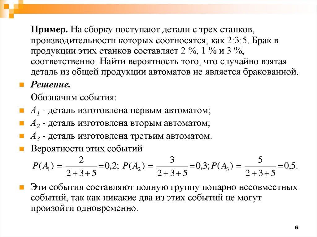 Пример. На сборку поступают детали с трех станков,производительности которых соотносятся, как 2:3:5. Брак в
