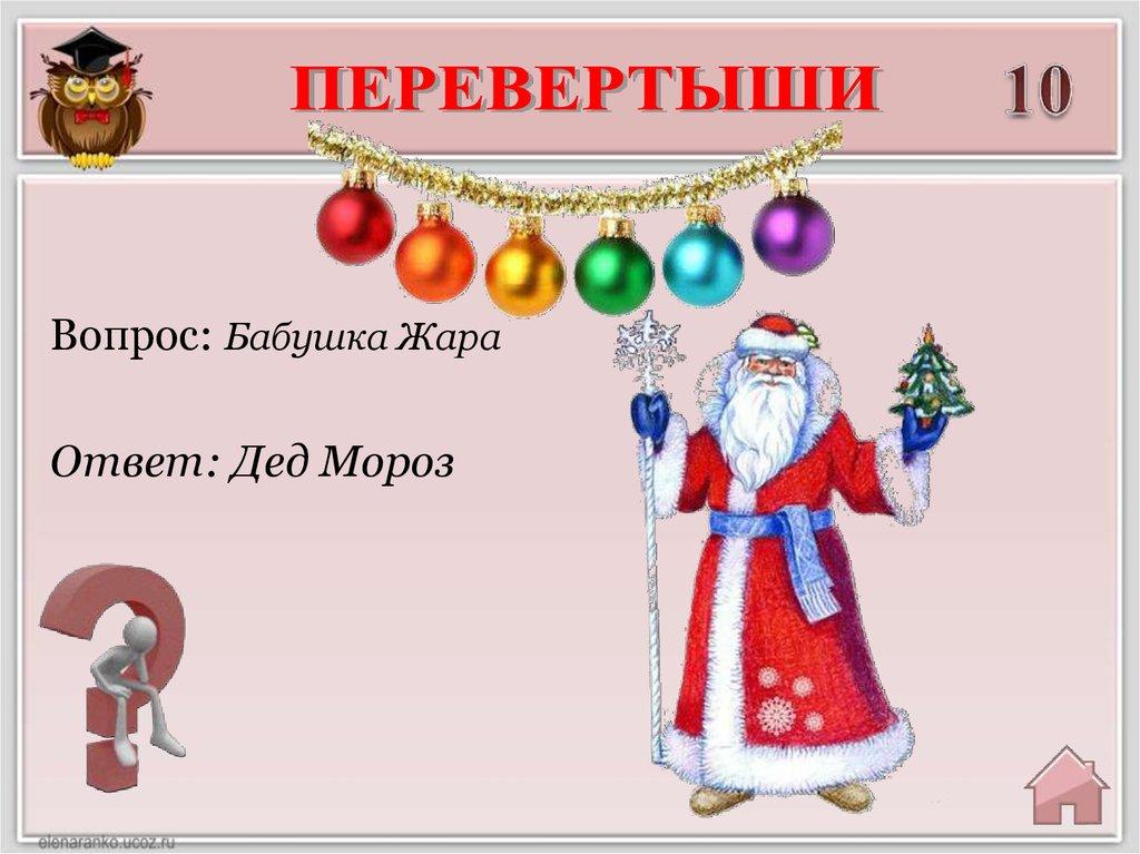 Вопрос: Бабушка ЖараОтвет: Дед Мороз