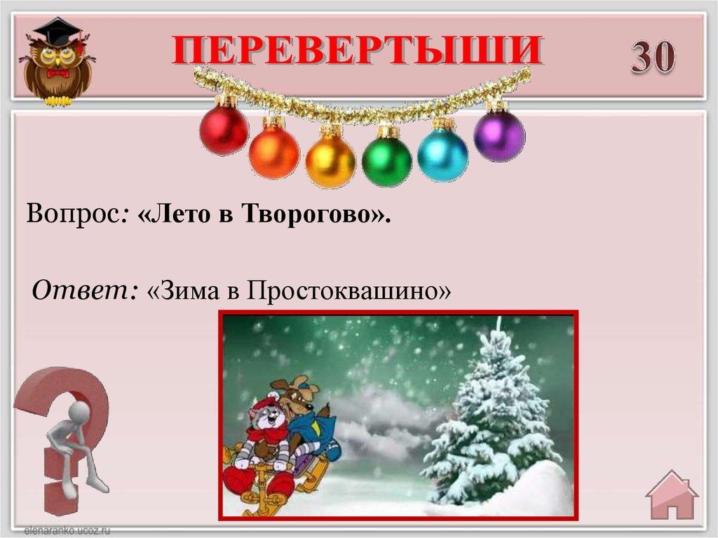 Вопрос: «Лето в Творогово».Ответ: «Зима в Простоквашино»