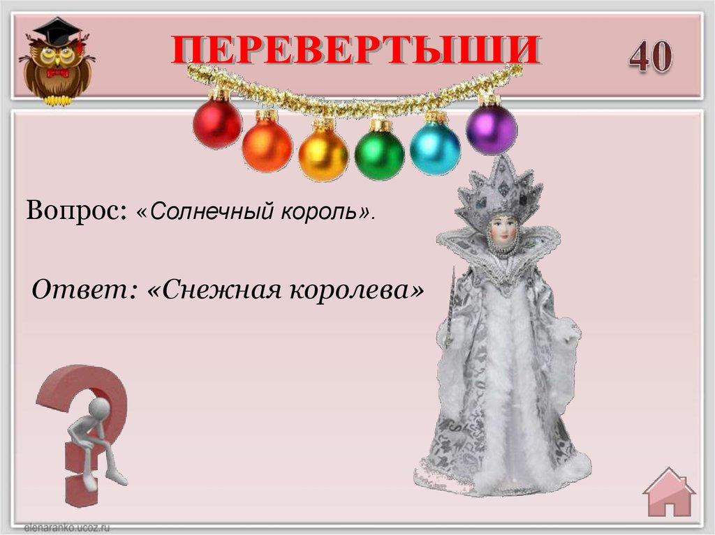 Вопрос: «Солнечный король».Ответ: «Снежная королева»