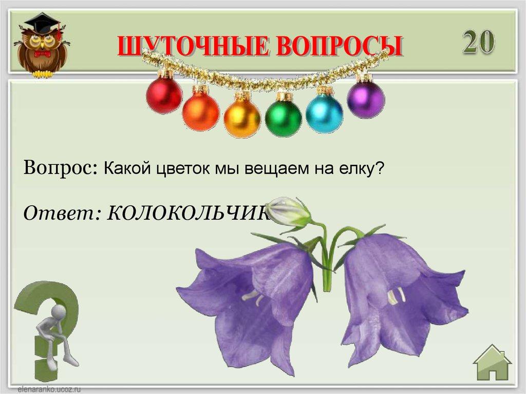 Вопрос: Какой цветок мы вещаем на елку?Ответ: КОЛОКОЛЬЧИК
