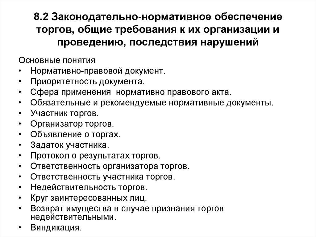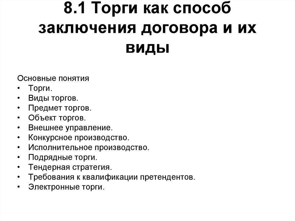 8.1 Торги как способ заключения договора и их виды.8.2 Законодательно-нормативное обеспечение торгов, общие