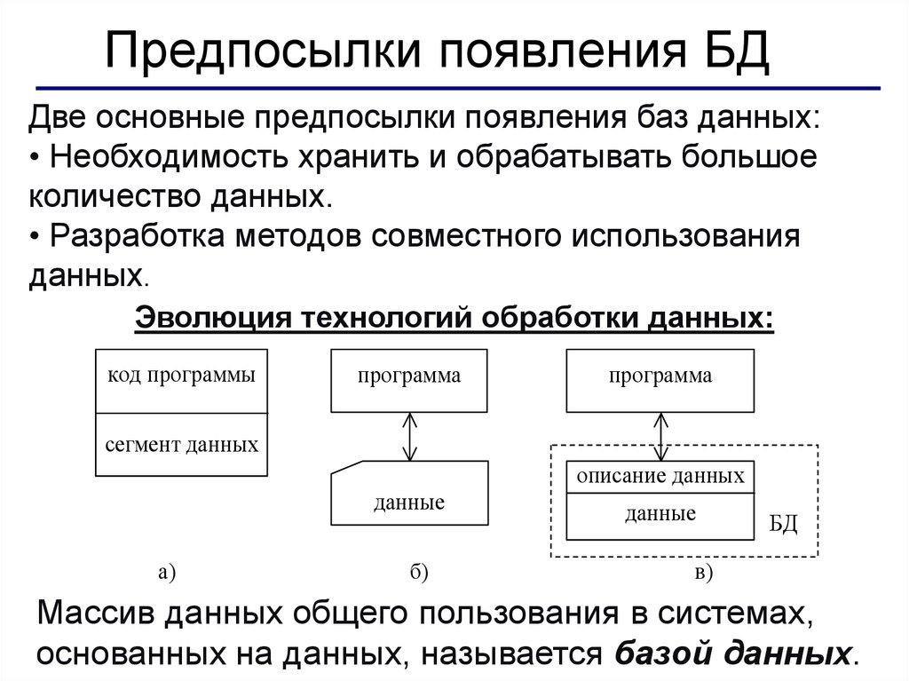 Предпосылки появления БДДве основные предпосылки появления баз данных: