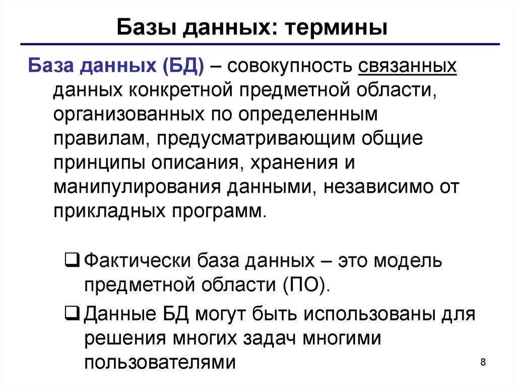 Базы данных: терминыБаза данных (БД) – совокупность связанных