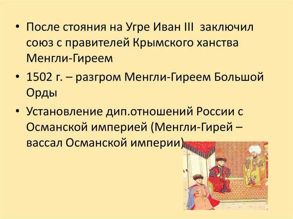 • После стояния на Угре Иван III заключилсоюз с правителей Крымского ханства