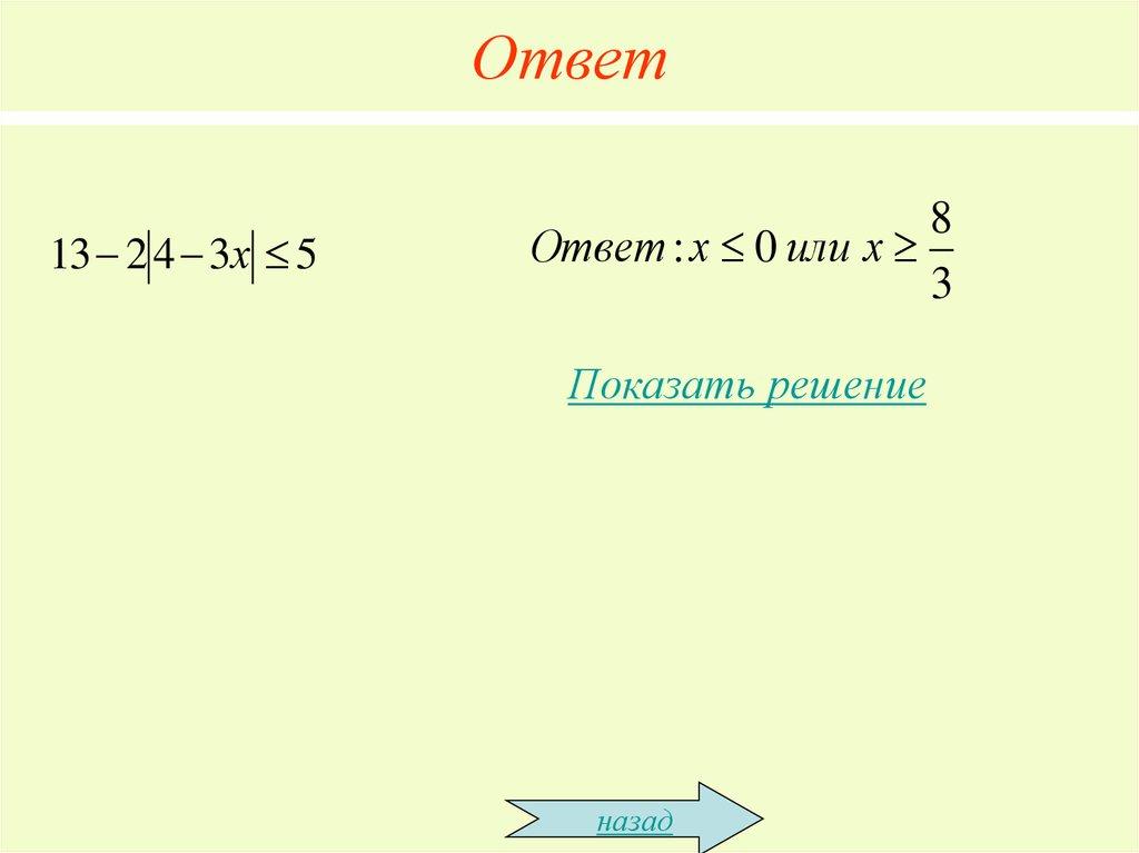 Решение: 2х – 5 = 13 или 2х – 5 = - 13