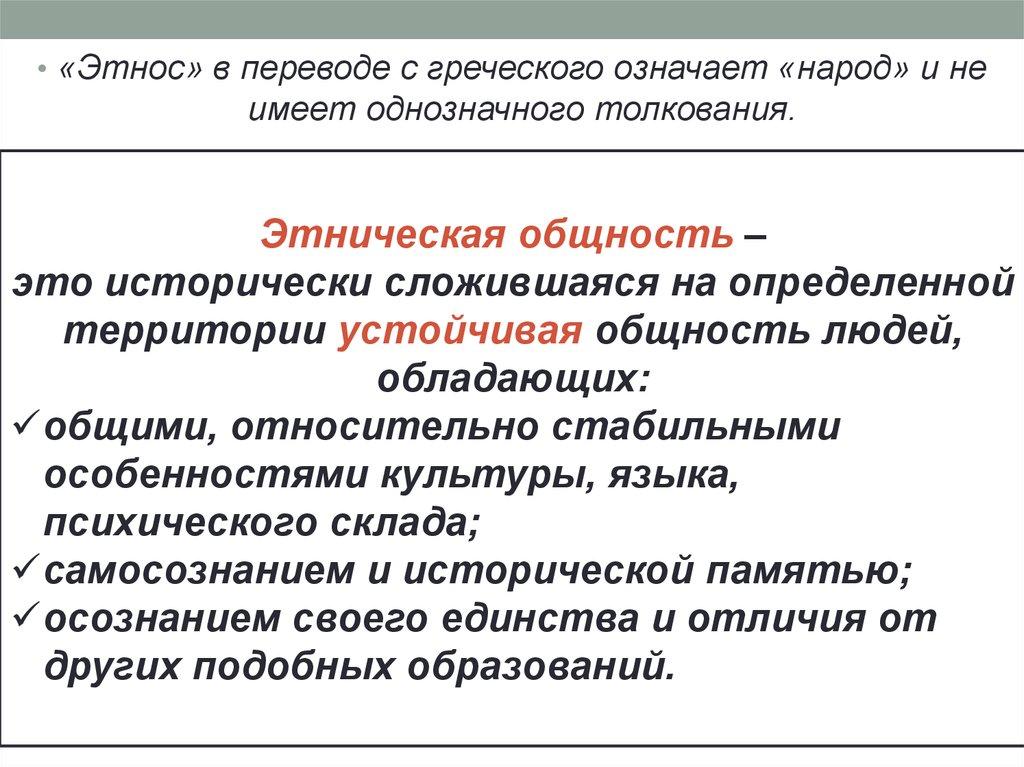 • «Этнос» в переводе с греческого означает «народ» и неимеет однозначного толкования.