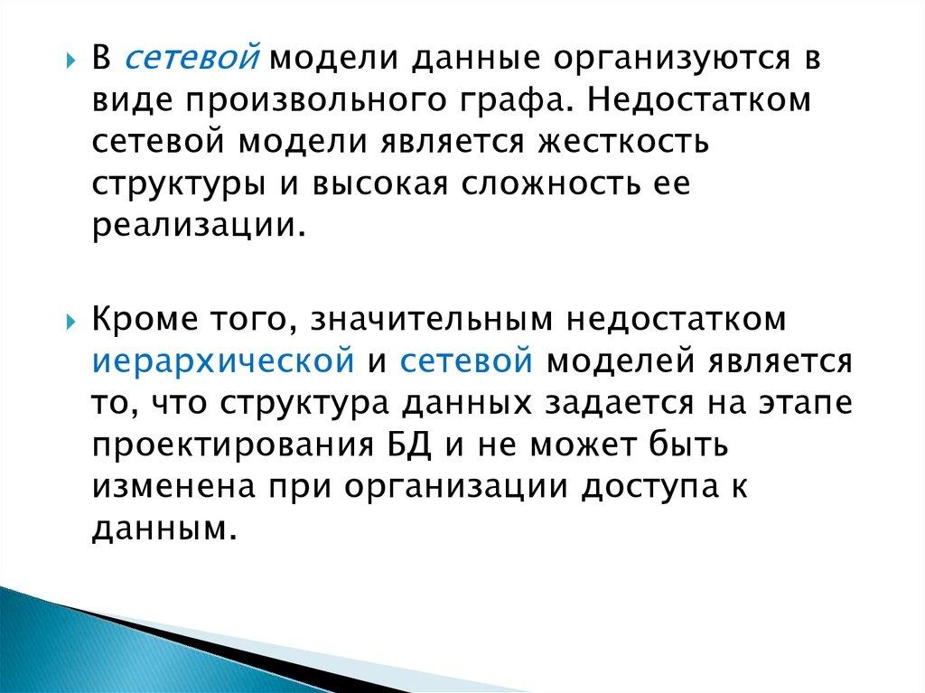 В сетевой модели данные организуются ввиде произвольного графа. Недостатком