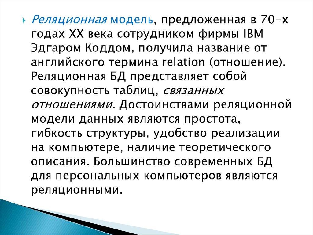 Реляционная модель, предложенная в 70-хгодах XX века сотрудником фирмы IBM