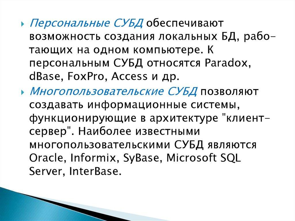 Персональные СУБД обеспечиваютвозможность создания локальных БД, работающих на одном компьютере. К
