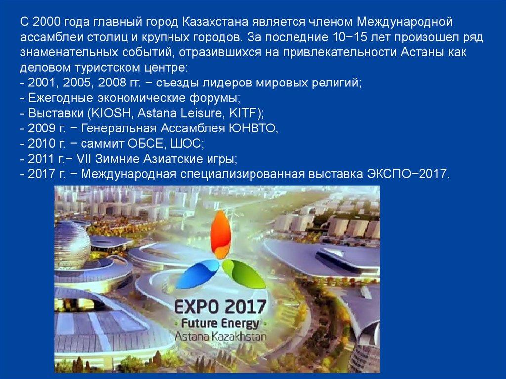 С 2000 года главный город Казахстана является членом Международнойассамблеи столиц и крупных городов. За последние 10−15 лет произошел ряд