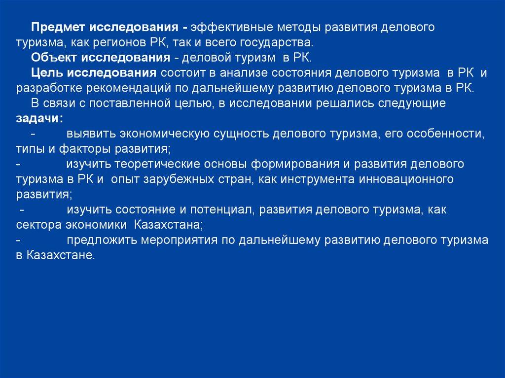 Предмет исследования - эффективные методы развития деловоготуризма, как регионов РК, так и всего государства.