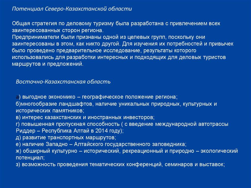 Потенциал Северо-Казахстанской областиОбщая стратегия по деловому туризму была разработана с привлечением всех