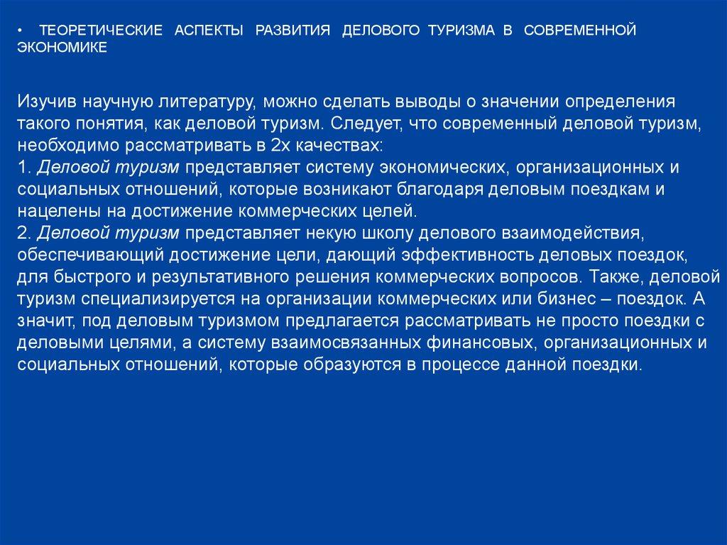 • ТЕОРЕТИЧЕСКИЕ АСПЕКТЫ РАЗВИТИЯ ДЕЛОВОГО ТУРИЗМА В СОВРЕМЕННОЙЭКОНОМИКЕ
