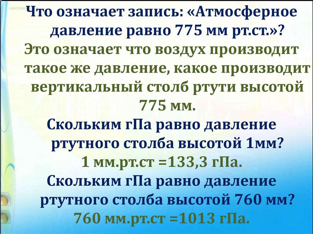 Что означает запись: «Атмосферноедавление равно 775 мм рт.ст.»?