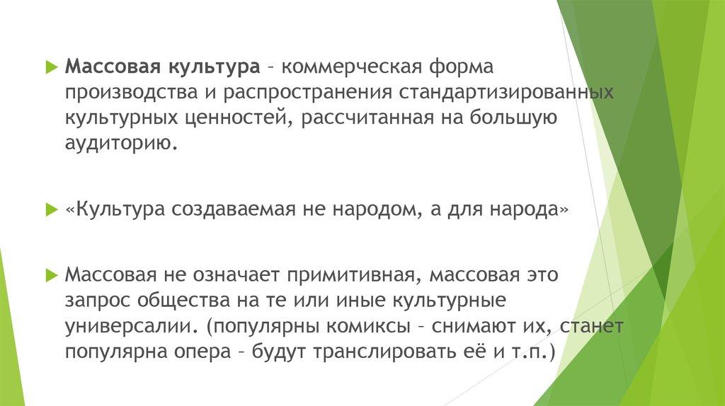 Массовая культура – коммерческая формапроизводства и распространения стандартизированных