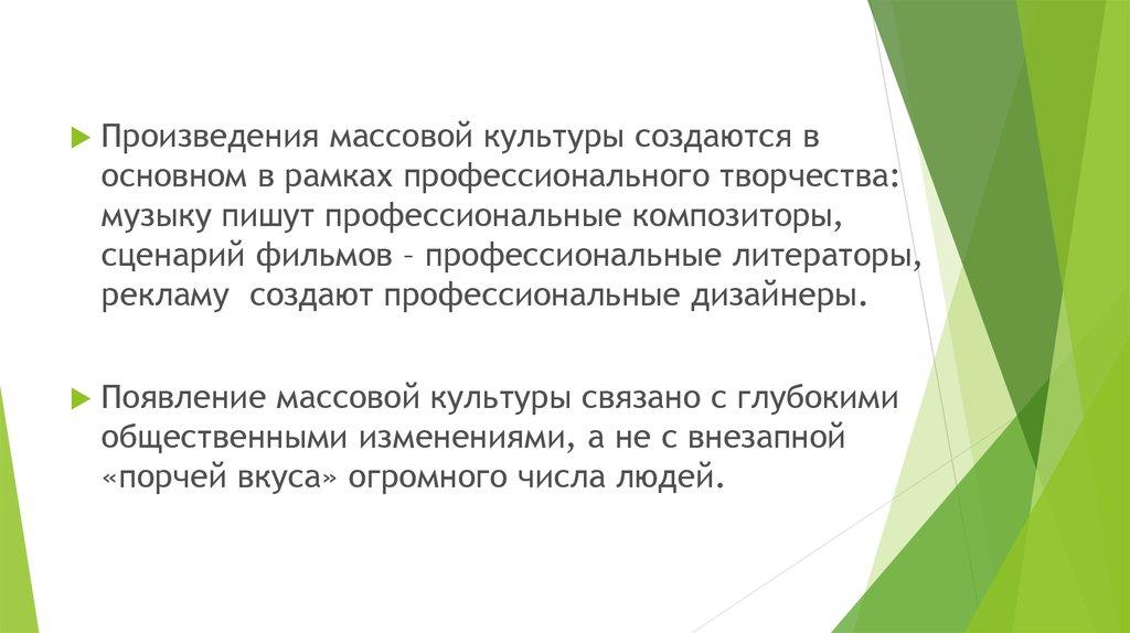 Произведения массовой культуры создаются восновном в рамках профессионального творчества: