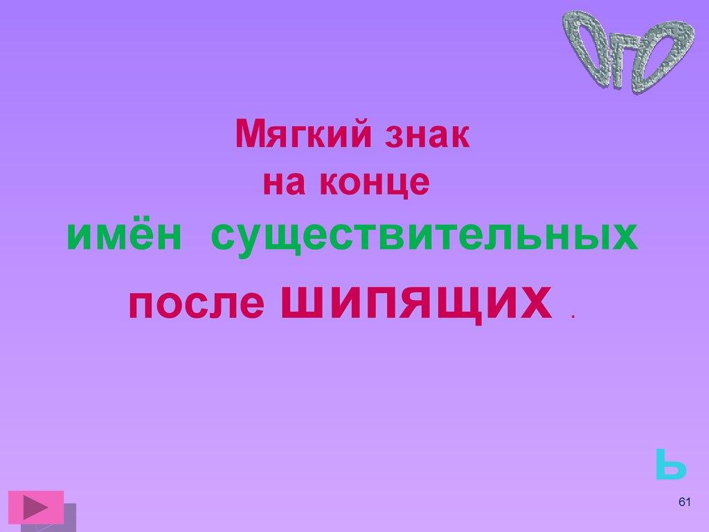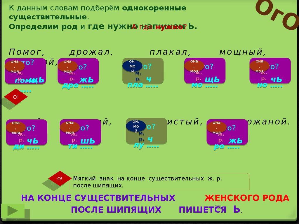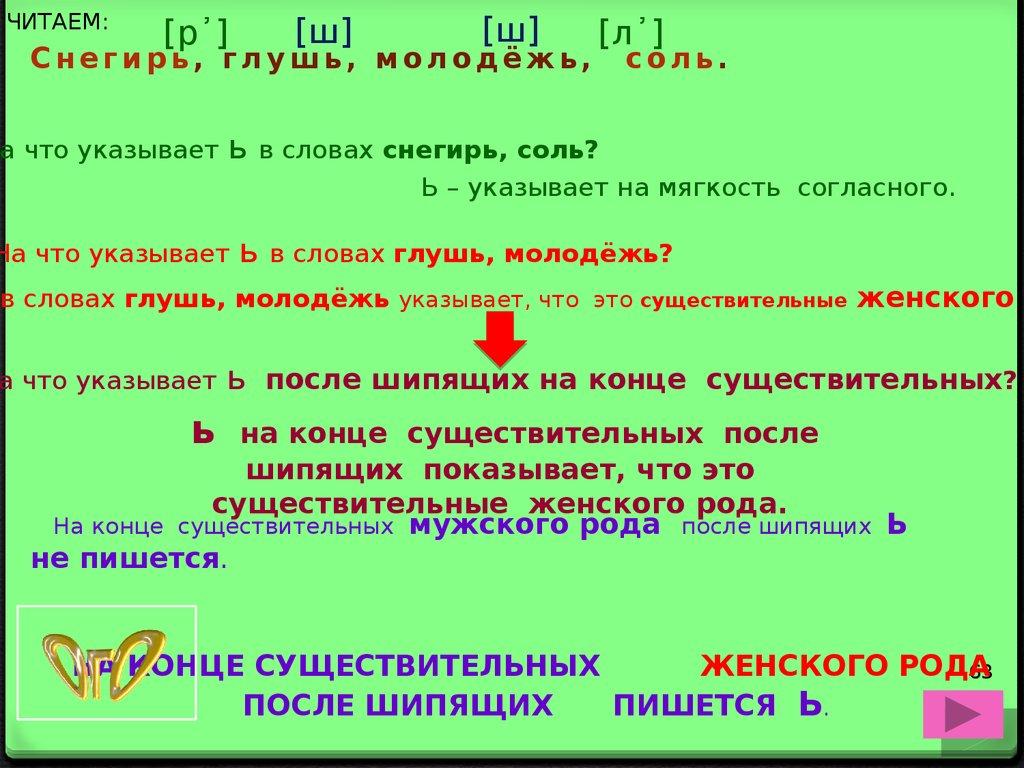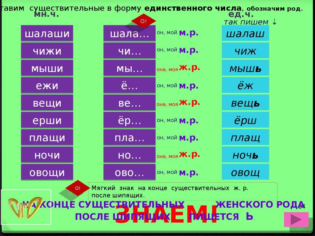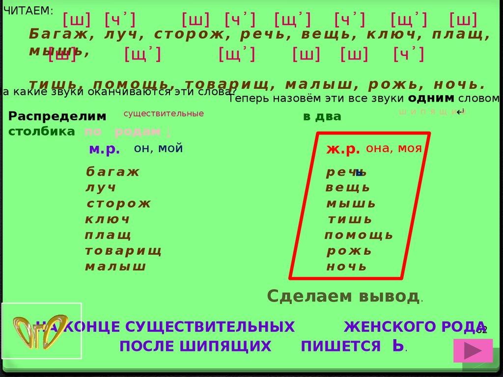 Мягкий знак на конце имён существительных ж.р. после шипящих.