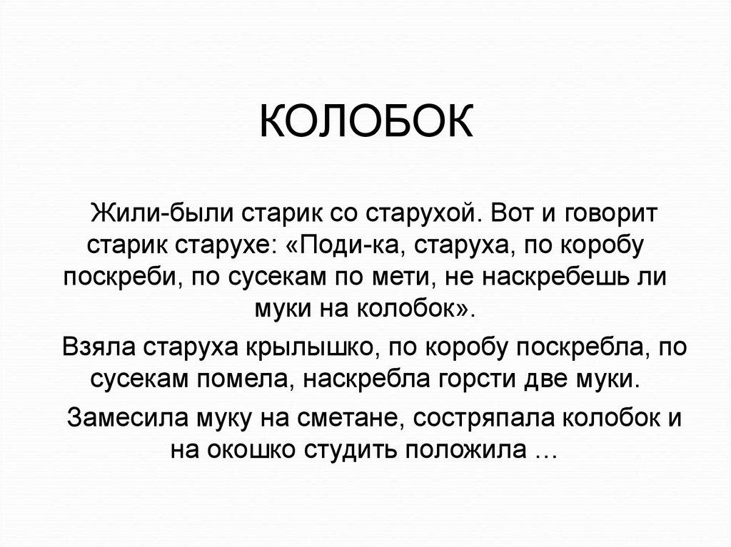 КОЛОБОКЖили-были старик со старухой. Вот и говорит