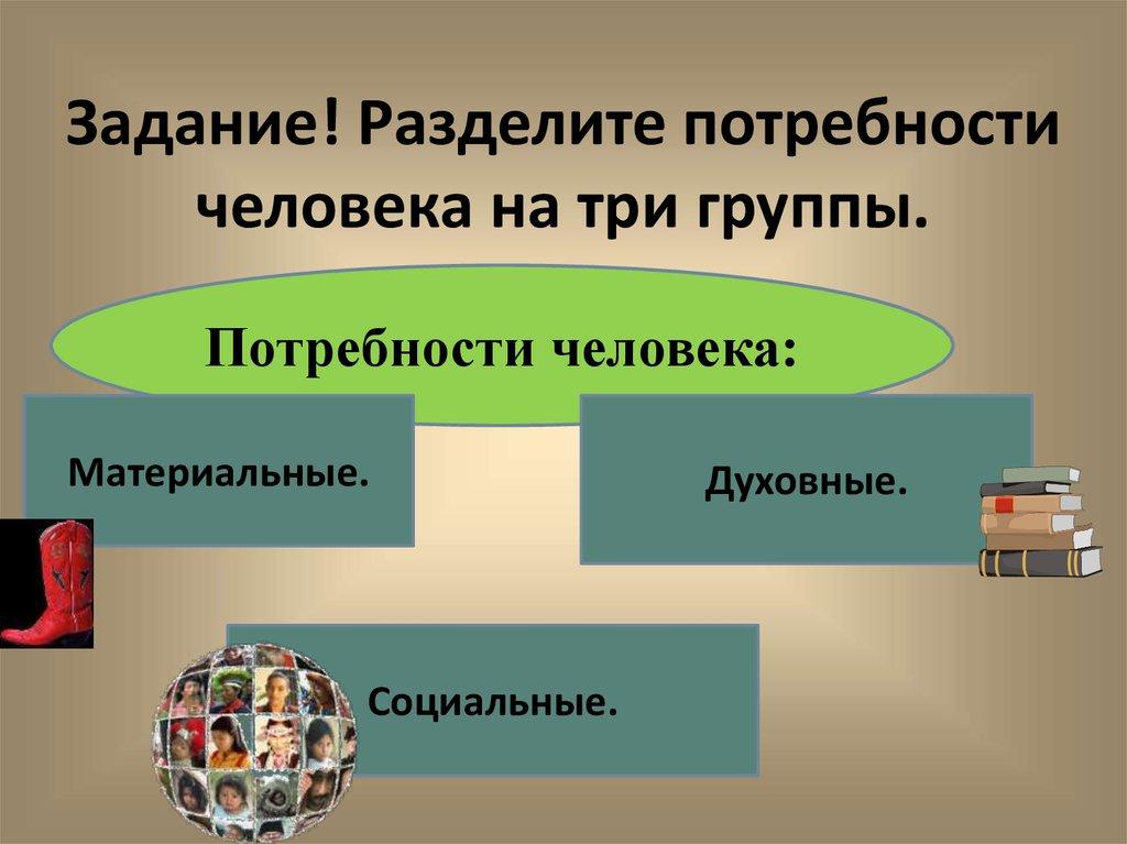 Задание! Разделите потребностичеловека на три группы.