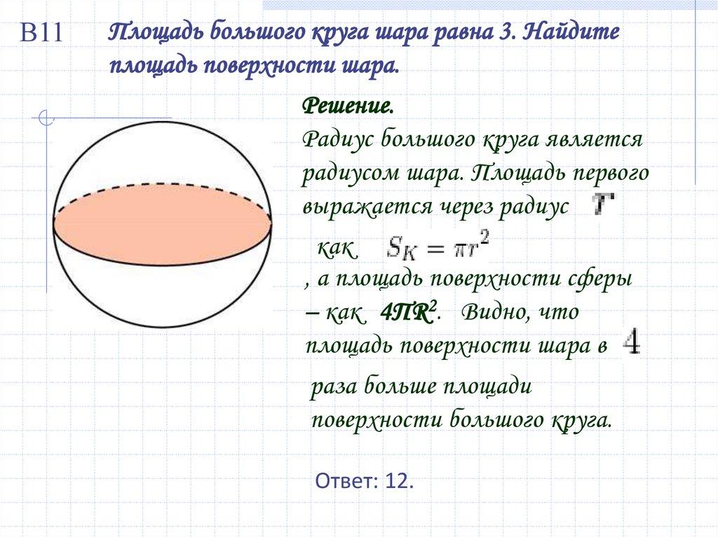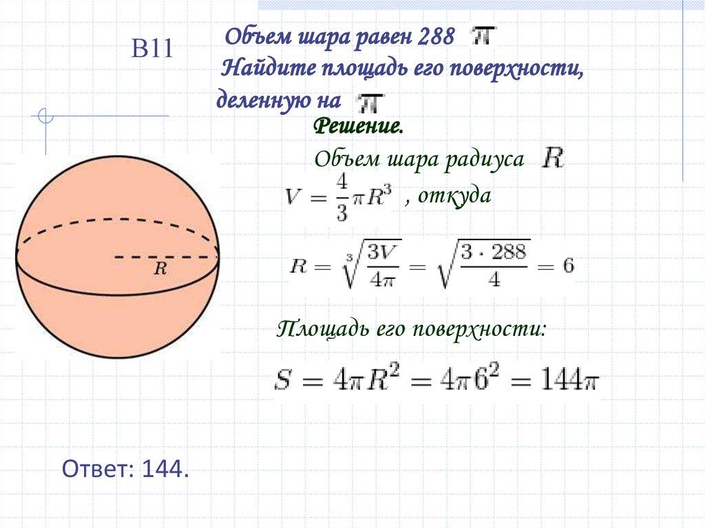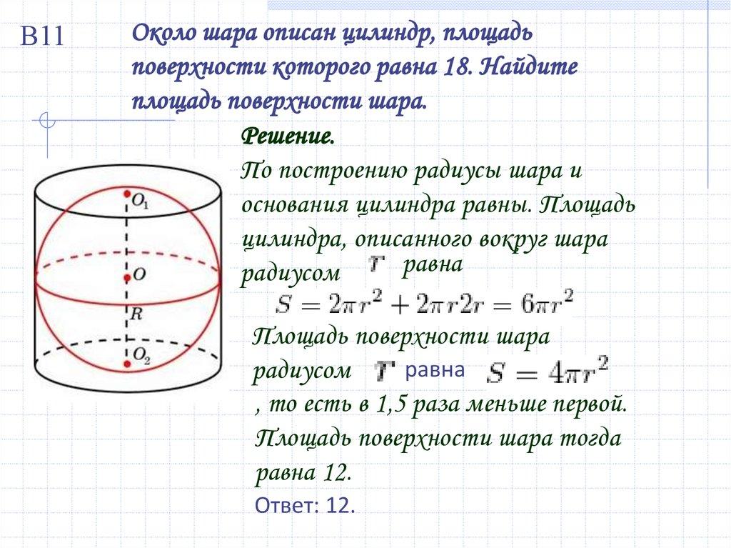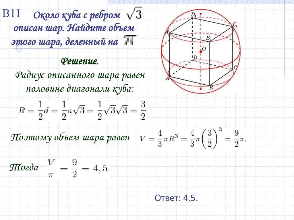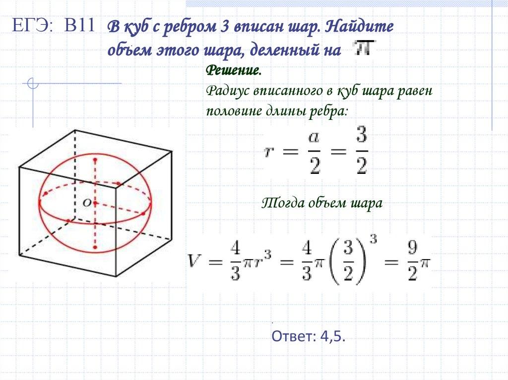 ЕГЭ: В11 В куб с ребром 3 вписан шар. Найдите.