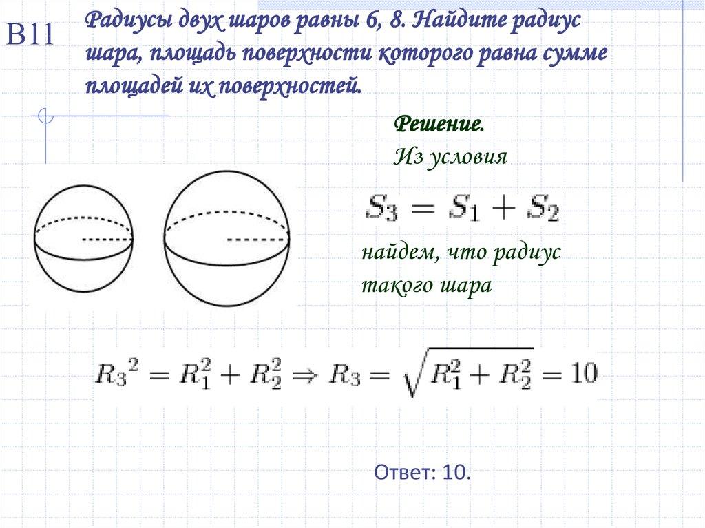 Радиусы двух шаров равны 6, 8. Найдите радиусВ11 шара, площадь поверхности которого равна сумме