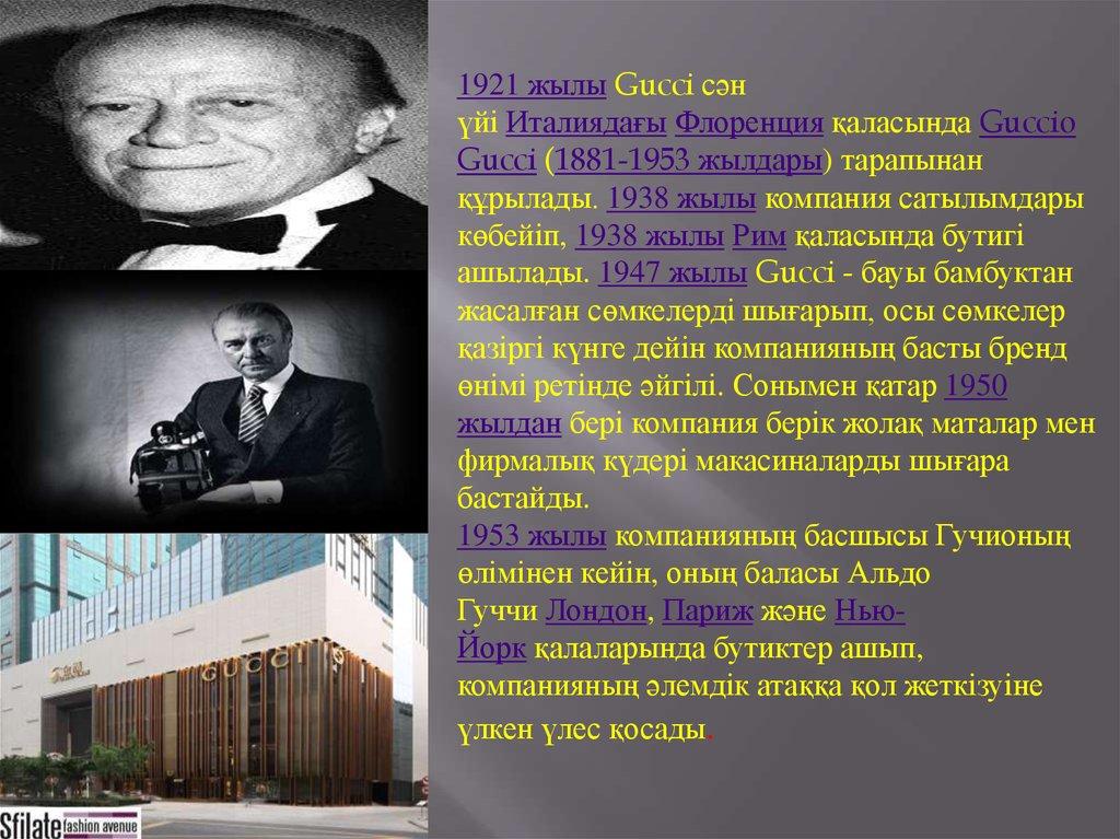 1921 жылы Gucci сәнүйі Италиядағы Флоренция қаласында Guccio