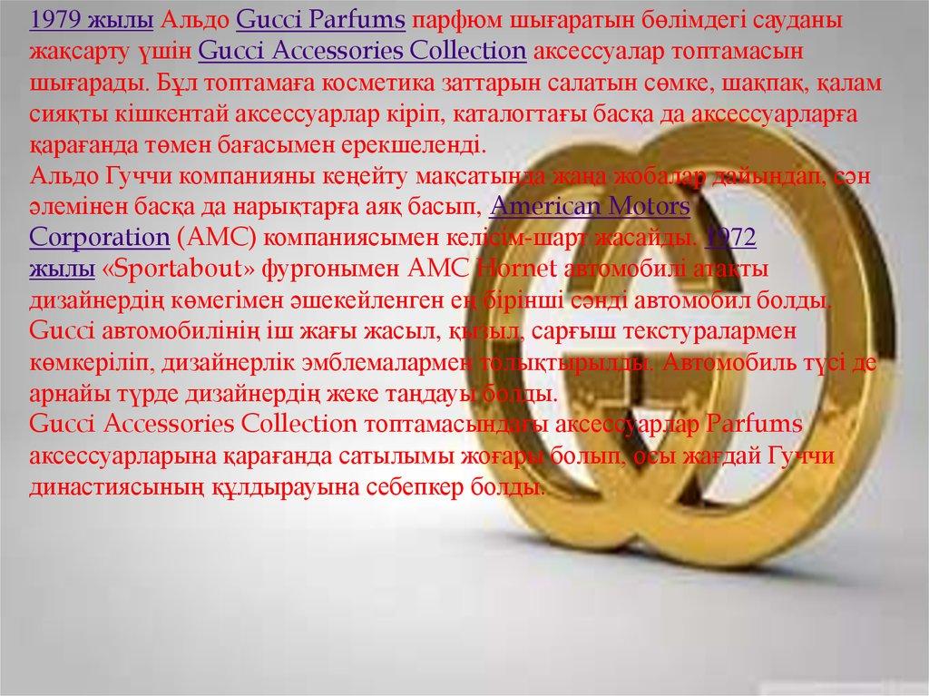 1979 жылы Альдо Gucci Parfums парфюм шығаратын бөлімдегі сауданыжақсарту үшін Gucci Accessories Collection аксессуалар топтамасын