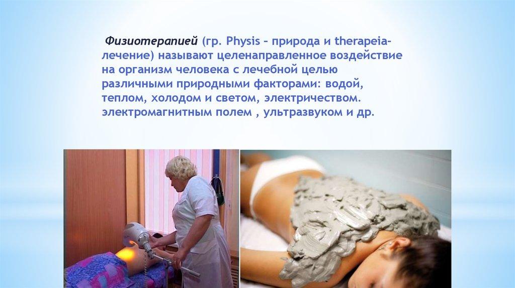 Физиотерапией (гр. Physis – природа и therapeiaлечение) называют целенаправленное воздействиена организм человека с лечебной целью
