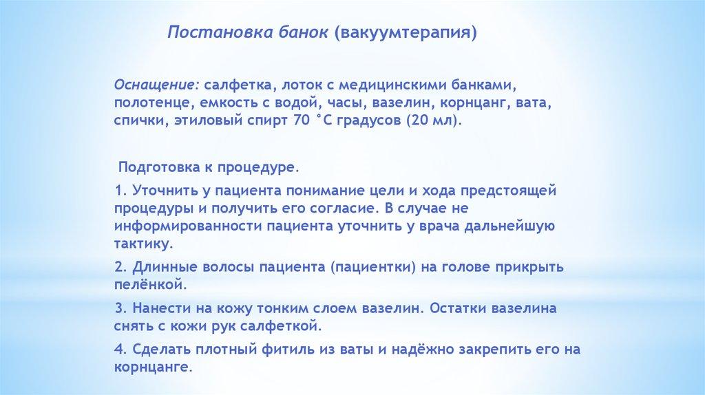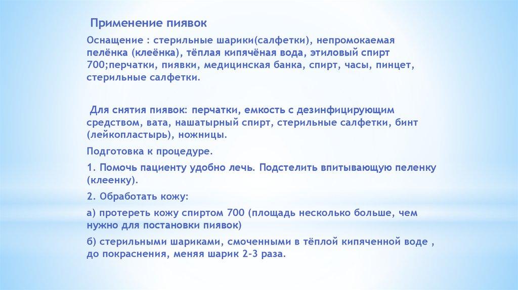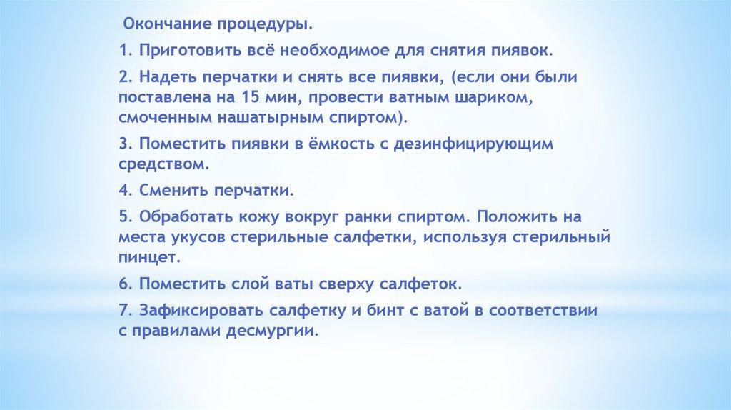 Окончание процедуры.1. Приготовить всё необходимое для снятия пиявок.