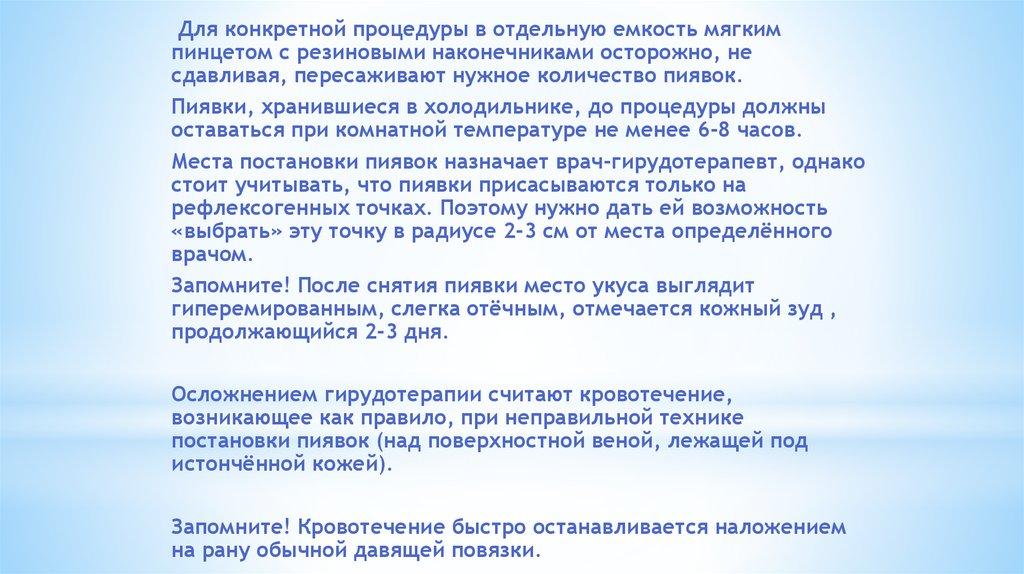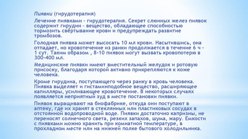 отпадает, но кровотечение из ранки продолжается в течение 6 ч 1 сут. Таким образом , 8-10 пиявок могут вызвать кровопотерю в