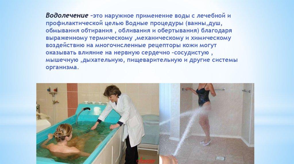 Водолечение –это наружное применение воды с лечебной ипрофилактической целью Водные процедуры (ванны,душ,