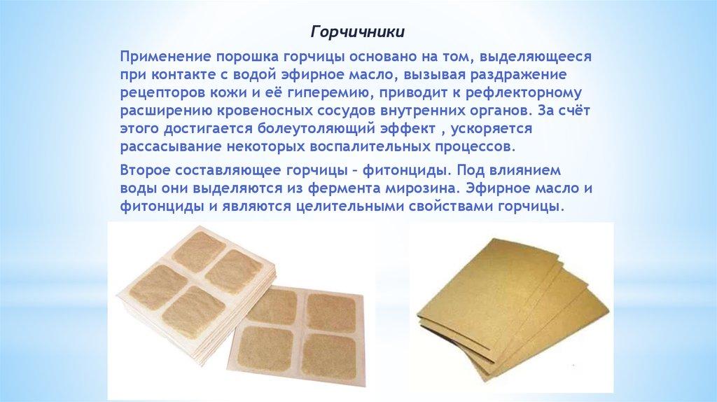 ГорчичникиПрименение порошка горчицы основано на том, выделяющееся