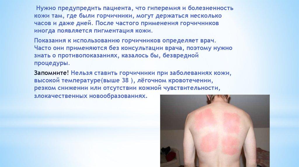 Нужно предупредить пациента, что гиперемия и болезненностькожи там, где были горчичники, могут держаться несколько