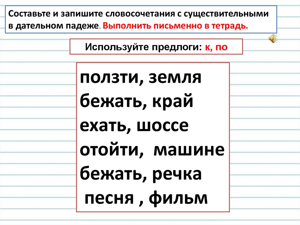 Составьте и запишите словосочетания с существительнымив дательном падеже. Выполнить письменно в тетрадь.