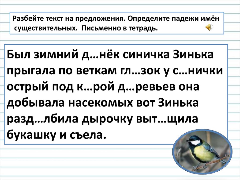 Разбейте текст на предложения. Определите падежи имёнсуществительных. Письменно в тетрадь.
