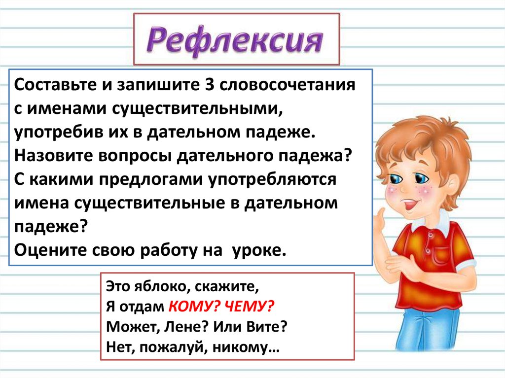 научиться распознавать имена существительные в дательном падеже;