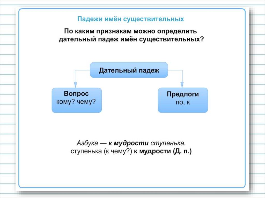 • Цель: ознакомление с особенностями дательного падежа; развитиеумения определять падеж по вопросу и предлогу.