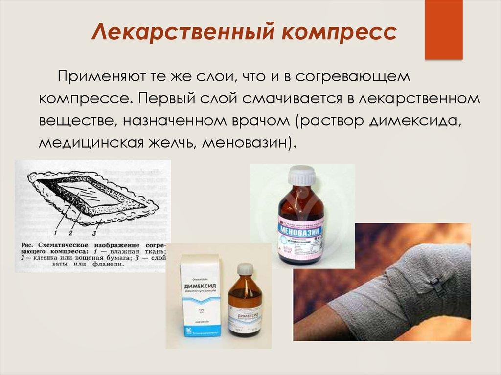 Применяют те же слои, что и в согревающемкомпрессе. Первый слой смачивается в лекарственном
